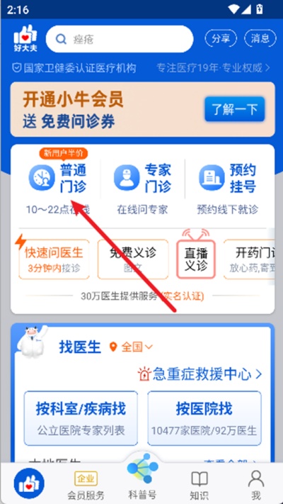 1、打开好大夫在线应用,在主界面点击“普通门诊”入口