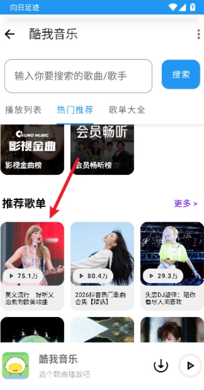3、进入音乐页面后,向下滑动页面可以浏览系统的推荐歌单列表,从中选择感兴趣的歌单并点击进入查看。