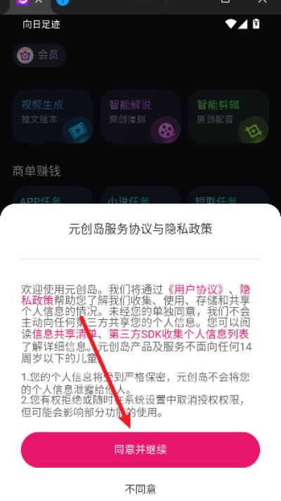 1、在手机设备上启动元创岛应用,进入初始界面后点击“同意并继续”选项,即可顺利进入软件主页开始浏览相关内容。