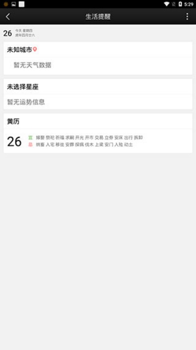3、点击页面中的“生活提醒”栏目后,可查看更详细的天气数据、星座运势以及黄历信息等内容。