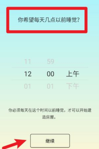 1、进入睡眠小镇后完成基础引导设置,根据个人实际情况选择每日最晚入睡时间,为后续作息计划的建立奠定基础。