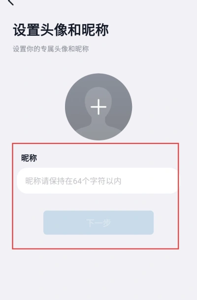 2、在设置头像与昵称页面填写昵称信息(不超过64个字符),可选择上传头像后点击【下一步】进入下一环节。