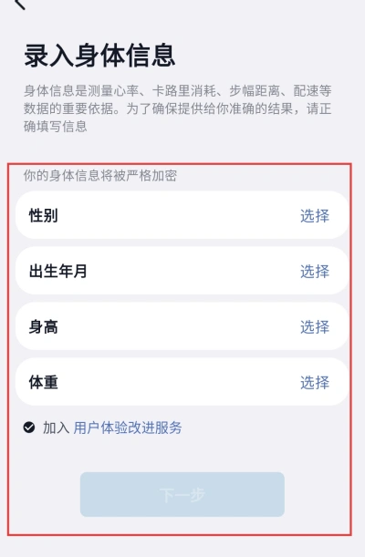 3、在身体信息录入页面依次选择性别、出生年月、身高与体重,并可勾选体验改进服务后点击【下一步】继续设置。