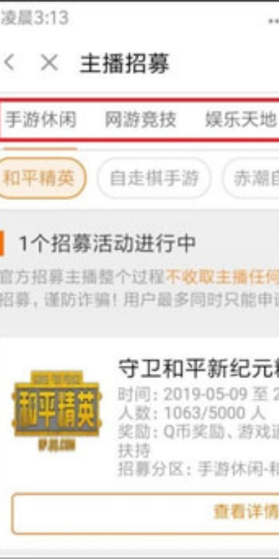 3、进入招募页面后可见多个直播分类板块包括手游休闲科技教育单机热游网络竞技娱乐天地与语音直播,根据需求选择细分类别并进入准备界面。