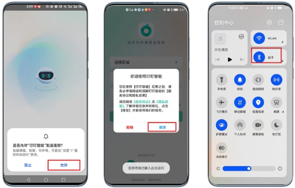1、安装“叮叮智能”按提示完成权限设置,开启通知并同意协议,连接前打开蓝牙确保设备正常识别。