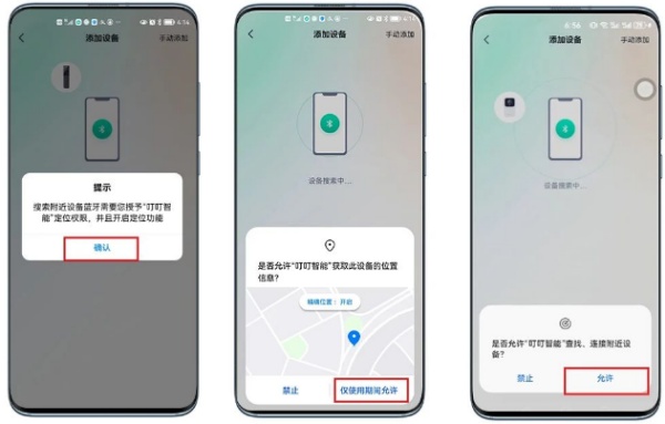 3、添加设备时开启定位权限并允许访问位置,同时打开蓝牙以便搜索并连接附近设备。