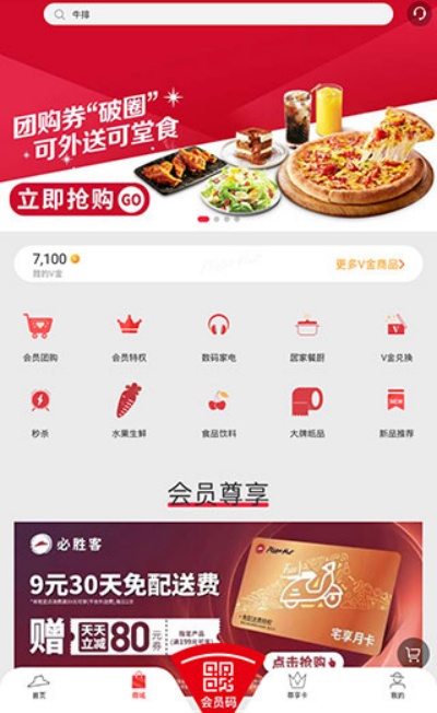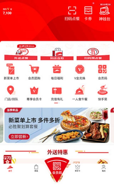 1、进入必胜客App首页后,可查看常用功能入口,包括新菜单上市、会员团购以及每日福利等内容,方便快速获取优惠与新品信息。