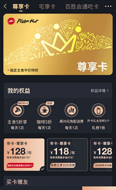 4、在“尊享卡”页面中,可查看并开通尊享卡、宅享卡及百胜会通吃卡等多种专属权益服务,开通后即可享受对应福利。