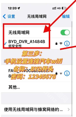 3、进入手机系统设置中的无线网络选项,搜索并连接车辆发出的WiFi信号,名称通常以BYD开头,输入对应密码12345678完成配对。