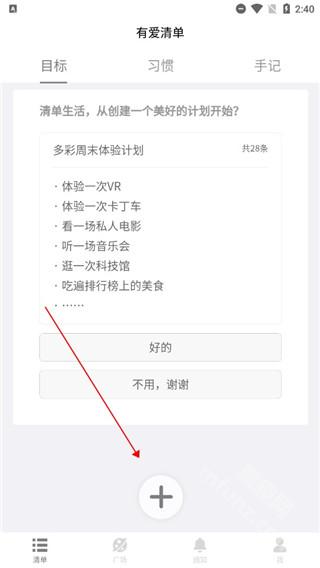 1、进入页面后,在底部功能栏中找到并点击【+】入口,用于新建事件或目标清单,进入创建流程后即可开始设置相关内容与信息。