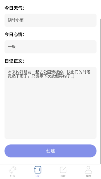 4、在日记编辑页面可填写天气、心情与正文内容,编辑完成后点击下方创建按钮即可保存记录。
