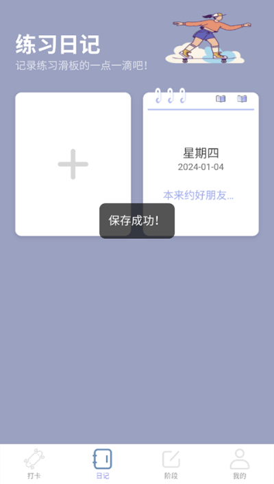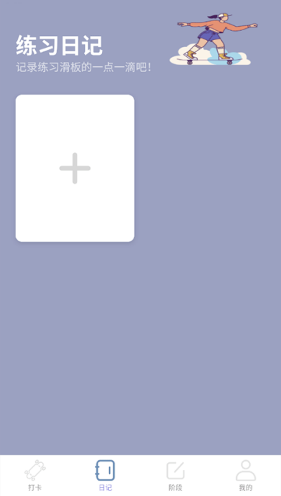 3、进入“日记”页面后点击“+”即可添加滑板练习记录,用于记录日常运动过程与成长内容。