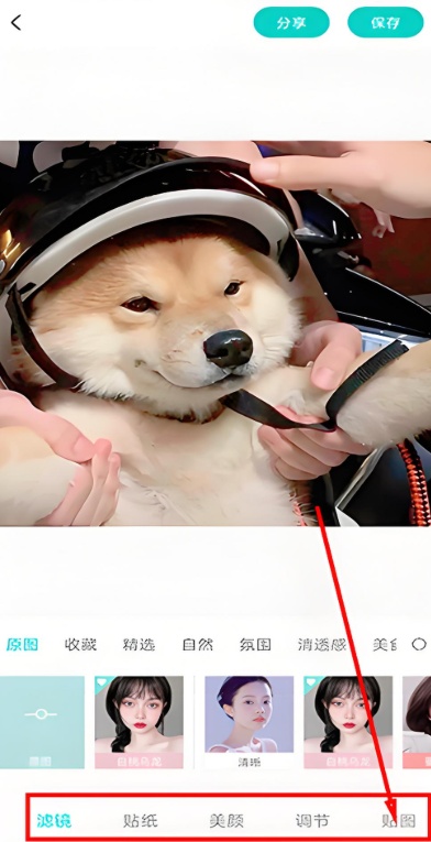 2、进入编辑界面后可对画面进行多维度处理,包括滤镜风格切换、贴纸叠加以及基础美颜调节等功能,在功能栏中选择“贴图”入口进入素材选择界面。