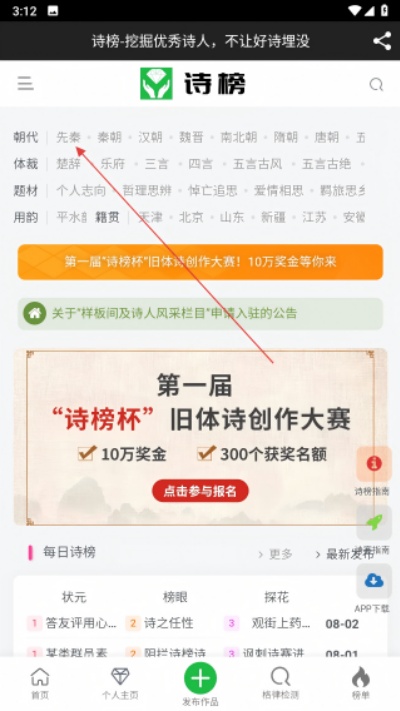 1、进入诗榜首页后选择朝代分类入口,如先秦或唐宋等,进入对应朝代诗词展示页面进行浏览。
