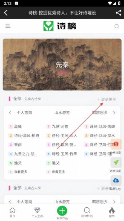 2、在朝代页面点击“更多榜单”选项,进入榜单筛选页面查看不同类型诗词排行内容。