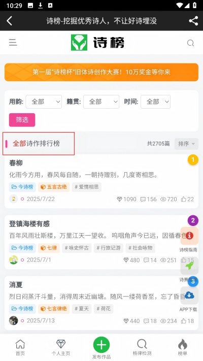 诗榜是一款面向古诗词鉴赏与创作交流场景的文化学习软件,围绕诗词阅读与内容解析构建完整学习体系,收录各朝代经典与小众诗词作品,支持按朝代与题材分类筛选查找,通过背景解析、意象说明与含义解读提升理解深度,使诗词学习过程更加清晰有序,帮助建立从作品阅读到内容分析再到创作表达的完整学习路径,适用于传统文化学习与诗词创作交流等多种文化应用场景需求。