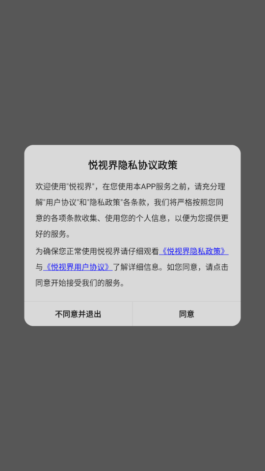 1、安装并点开悦视界软件。在初次见面时,请阅读并点击“同意”隐私政策与服务协议,这是开启安全、纯净观影旅程的第一步。