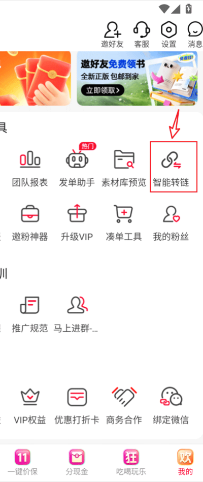 2、在个人中心页面中查找“智能转链”功能选项,点击进入链接转换与推广工具使用界面。