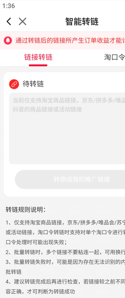3、在智能转链页面中输入需要转换的商品或推广链接,系统即可自动完成链接转化并生成可用推广链接。