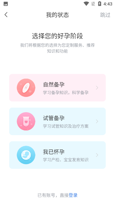 1、打开好孕说App后,首先根据自身情况选择当前所处的好孕阶段,便于获得更精准的内容推荐。