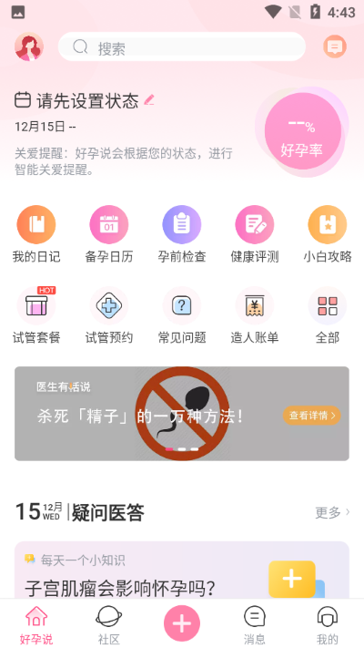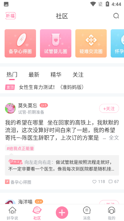 4、在社区板块中,可以与其他备孕姐妹分享心情、交流经验,共同学习并安心备孕。