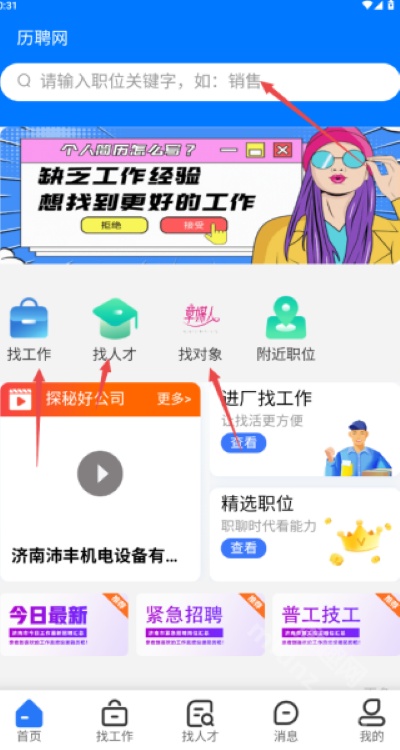 1、进入历聘网App首页后,可直接搜索岗位信息,并在“找工作”和“找人才”板块中快速切换浏览。