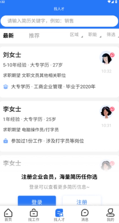 3、“找人才”板块为企业及用人单位提供简历查阅功能,便于高效匹配所需人才。