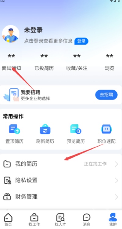 4、在“我的”页面中,可编辑和完善个人简历,同时查看投递记录与面试邀请信息。