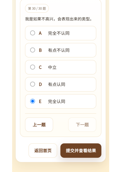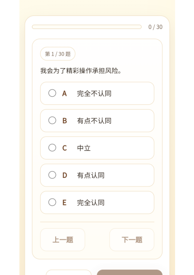 2、测试共30道题目,根据自身真实想法选择对应选项作答。