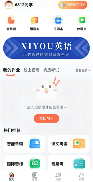 1、在应用“首页”中找到并点击【立即加入】按钮,进入班级加入功能入口,准备进行班级信息绑定操作。