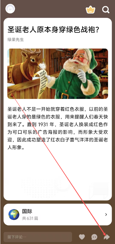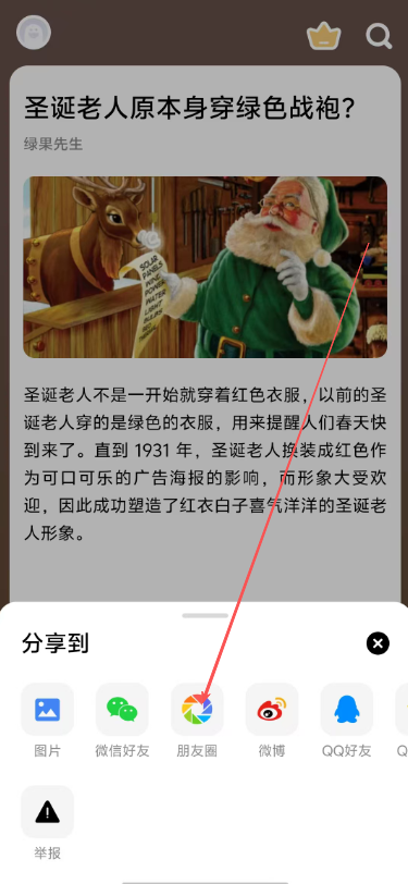 1、在打开《冷知识酱》软件后,进入想要分享的知识内容页面,在页面下方可以看到分享按钮,点击底部的分享图标即可进入分享选项界面。